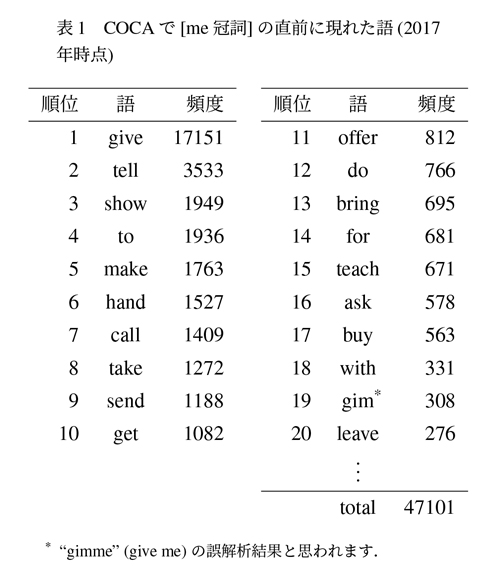 ここから、冠詞のような意味をほとんど持たず、発音上も目立たない要素でも、構文全体の認識にとっては大きな手掛かりとなる、という可能性が見えてきます。(*1) 実際、以前筆者が現代アメリカ英語の大規模コーパスである Corpus of Contemporary American English(COCA:Davies, M、2008)を用いて行った調査(吉川正人「悪魔は細部に宿る: 構文認識の分散的手掛かりとしての英語冠詞から探る聞き手指向の文法論」)では、“Call me a taxi.” のように me の直後に冠詞(a、an、the など)が続く配列([me 冠詞])があったとき、その直前に現れる語はほとんどが give や tell、show など二重目的語構文(SVOO)で用いられる動詞でした(表1)。(*2) 特に全体の三分の一以上が give であることを鑑みると、“○○○ me a △△△” という並びだけでかなりの確率で表現全体が二重目的語構文であることを推測できそうです。もちろんこの配列だからといって必ず二重目的語構文になるわけではありませんが、一つの有効な手掛かりであることは間違いないでしょう。