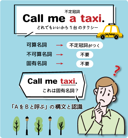 「タクシーを呼んでくれ」のつもりで “Call me taxi” と言っても、相手から「タクシー」と呼ばれるだけなのはなぜですか