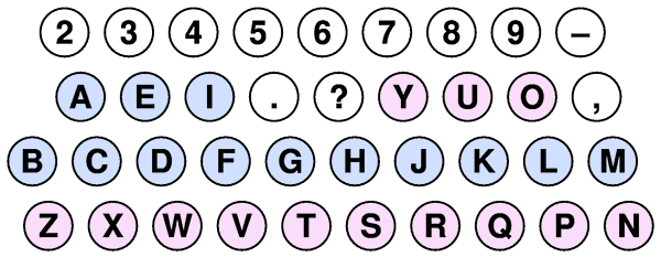 Stickneyは,五十音の各行をそれぞれ近くに集めておいた方がキー配列が覚えやすい,と考えました。そこで,アイウエオを上の方に,カキクケコをまん中に,サシスセソをその左下に,タチツテトをそのまた左に,という形で作っていったのが,このキー配列です。それぞれのキーに2つずつ文字が入っていて,数字やセソヘケなどはシフトキーを押しながら打つしかけでした(図5参照)。